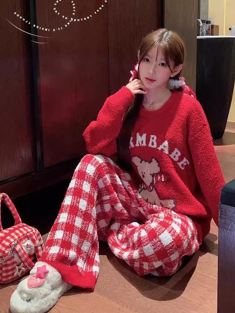 RomieHome ボアモコモコレッドくまさんモチーフパジャマ 秋冬用かわいいルームウェア パジャマ 上下セットアップ パジャマ ワッフルリボン かわいい 秋パジャマ セットアップ 大きいサイズパジャマ rh25111901