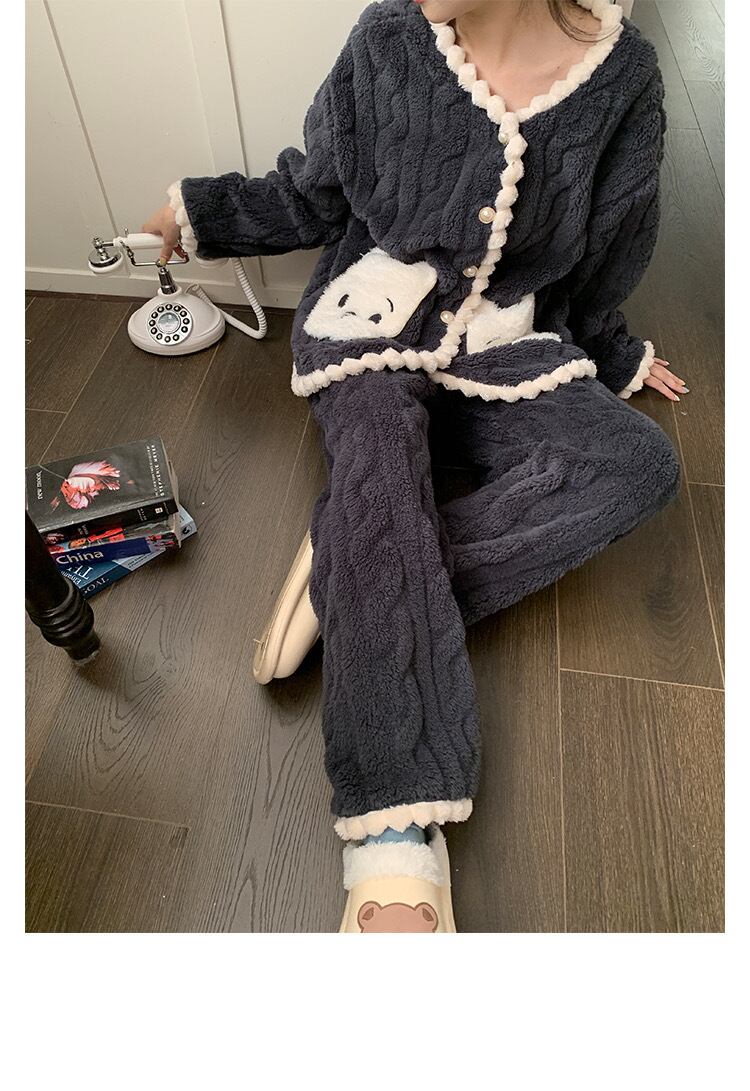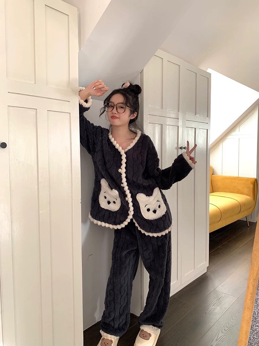 RomieHome 秋冬 くまさんポケットルームウェア モコモコ上下セットアップ パジャマ かわいい パジャマ セットアップ rh23102403